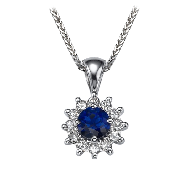 Dieser leuchtende Diamant Anhänger hängt von einer Kette mit einem Gesamtdiamantkaratgewicht von 0.59 karat. Steinstruktur: Blue Sapphire & Diamond.